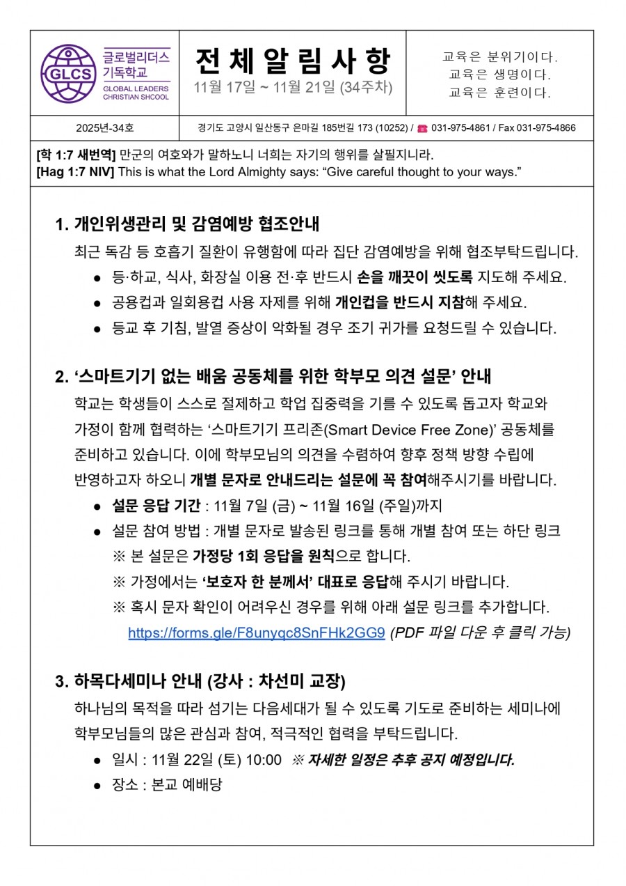 주소 : (10252) 경기도 고양시 일산동구 은마길 185번길 173 (성석동 1061-38) 글로벌리더스기독학교