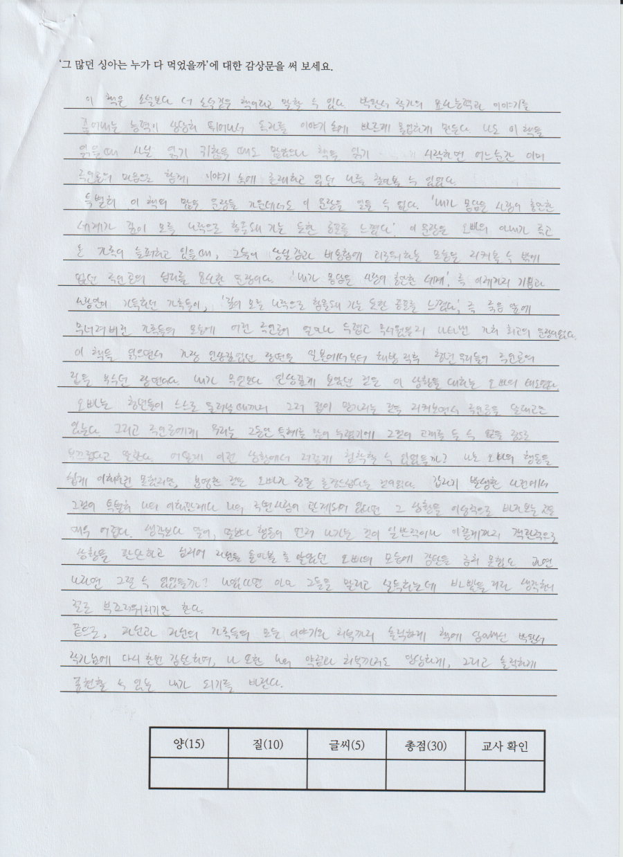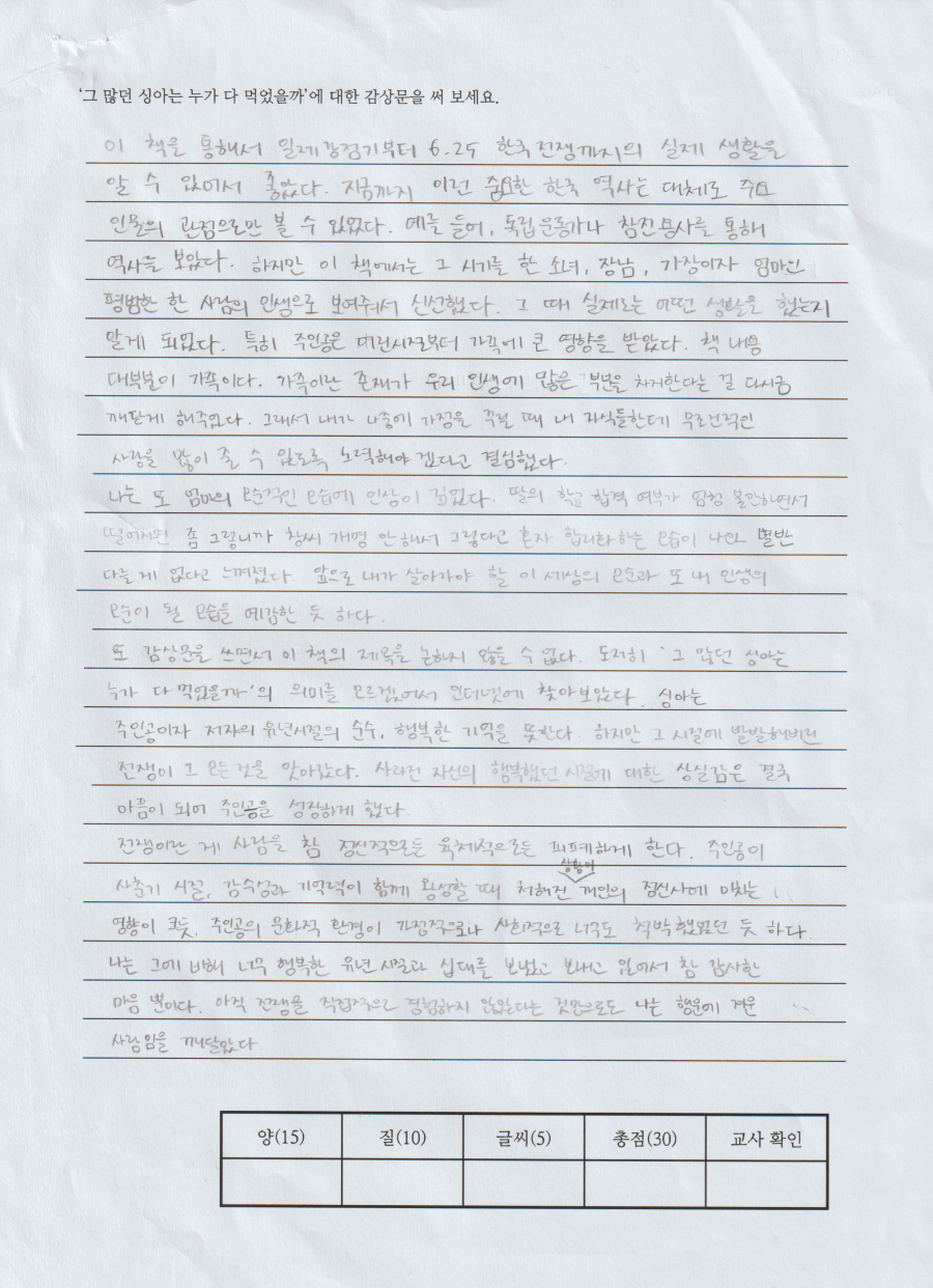 고등부 독후활동 - 그 많던 싱아는 누가 다 먹었을까? 페이지 정보 작성자 관리자 댓글 0건 조회 256회 작성일 25-04-24 16:11 본문 고등부 독후활동 - 그 많던 싱아는 누가 다 먹었을까? 지도교사: 차선미 교장12학년 문선유 12학년 이주영 11학년 김민광 11학년 박한승 11학년 이온빈 목록 댓글목록 댓글목록 등록된 댓글이 없습니다.