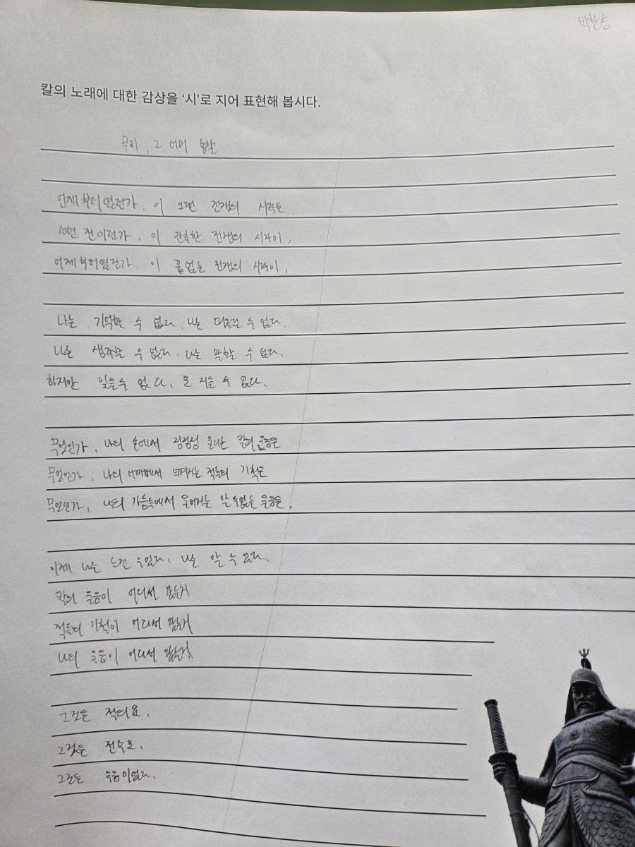 칼의 노래 - 고등 독서지도 수업 페이지 정보 작성자 관리자 댓글 0건 조회 62회 작성일 25-11-03 09:31 본문 책 제목: 칼의 노래대상: 고등부지도교사: 차선미아래의 독후 활동지는 '칼의 노래'를 읽고 시로 감상을 표현한 내용입니다. 목록 댓글목록 댓글목록 등록된 댓글이 없습니다.