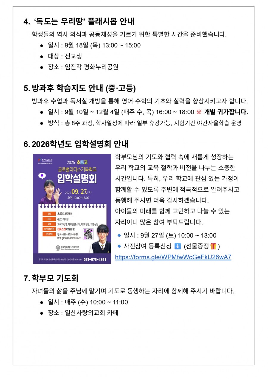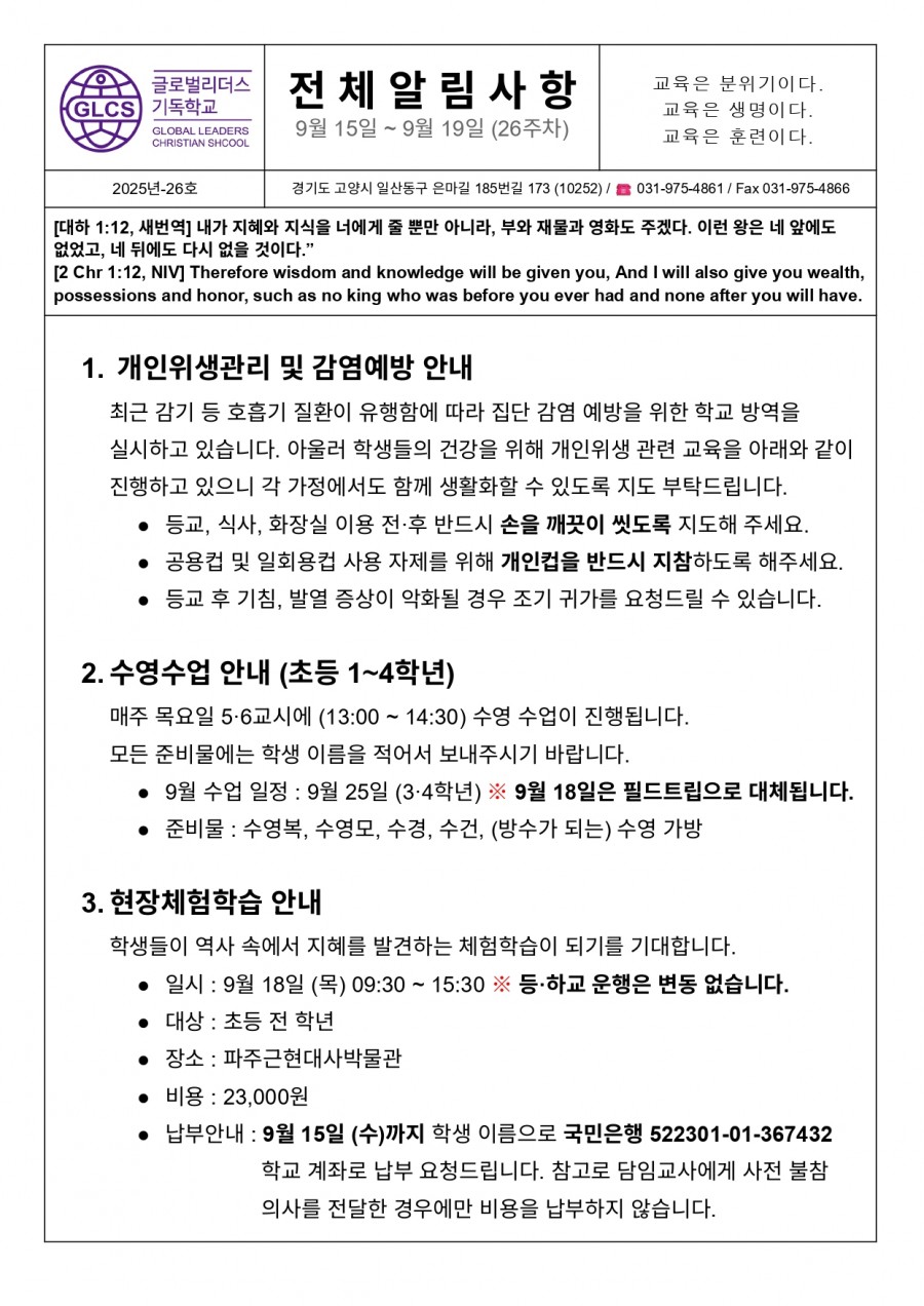주소 : (10252) 경기도 고양시 일산동구 은마길 185번길 173 (성석동 1061-38) 글로벌리더스기독학교