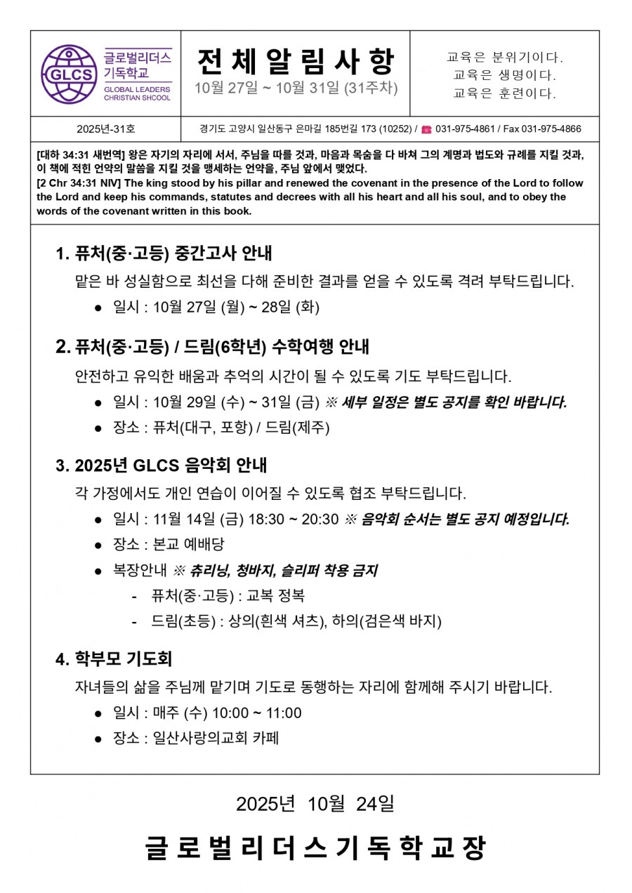 주소 : (10252) 경기도 고양시 일산동구 은마길 185번길 173 (성석동 1061-38) 글로벌리더스기독학교